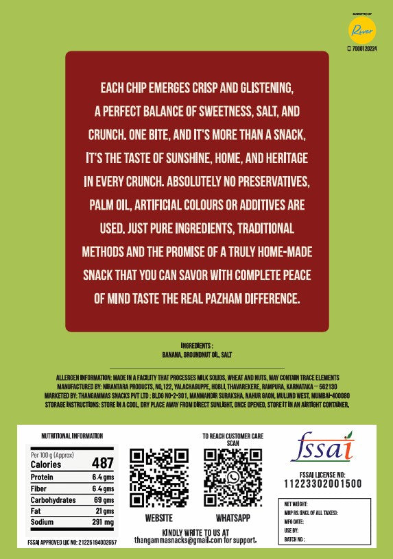Absolutely no preservatives, Palm Oil, Artificial Colours or Additives are used. Just Pure Ingredients, Traditional Methods and the promise of a truly home-made snack that you can savor with complete peace of mind Taste the real pazham difference.
