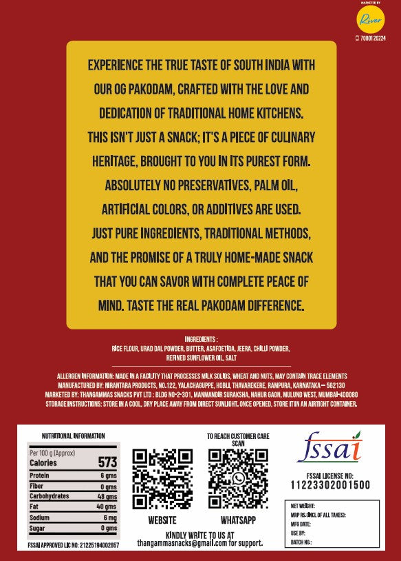 Absolutely no preservatives, palm oil, artificial colors, or additives are used. Just pure ingredients, traditional methods, and the promise of a truly home-made snack that you can savor with complete peace of mind. Taste the real pakodam difference.